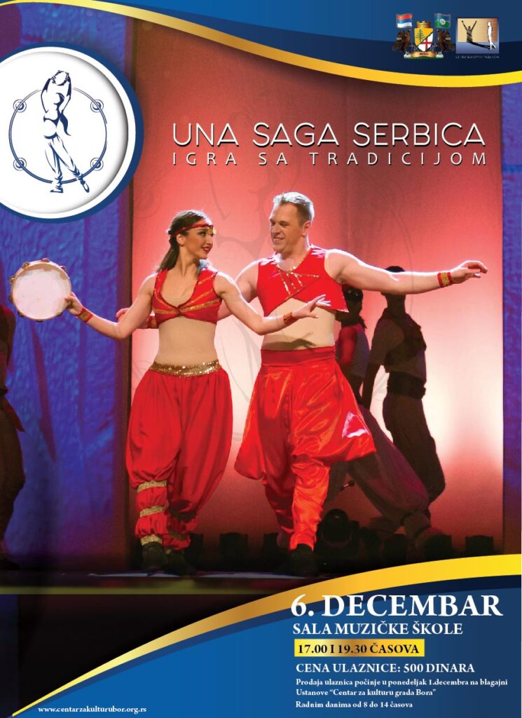 Установа „Центар за културу града Бора“ организује два концерта ансамбла „Una Saga Serbica“. Mузичко – сценски спектакл базиран на разноликости ритмова Србије и Балкана биће представљен борској публици 6. децембра 2025. године у сали Музичке школе у два термина од 17.00 и 19.30 часова. Цена улазнице је 500,00 динара. Улазнице се могу купити на благајни „Установе Центар за културу града Бора“, радним даним од 8 до 14 часова. Продаја улазница почиње у понедељак 1. децембра.