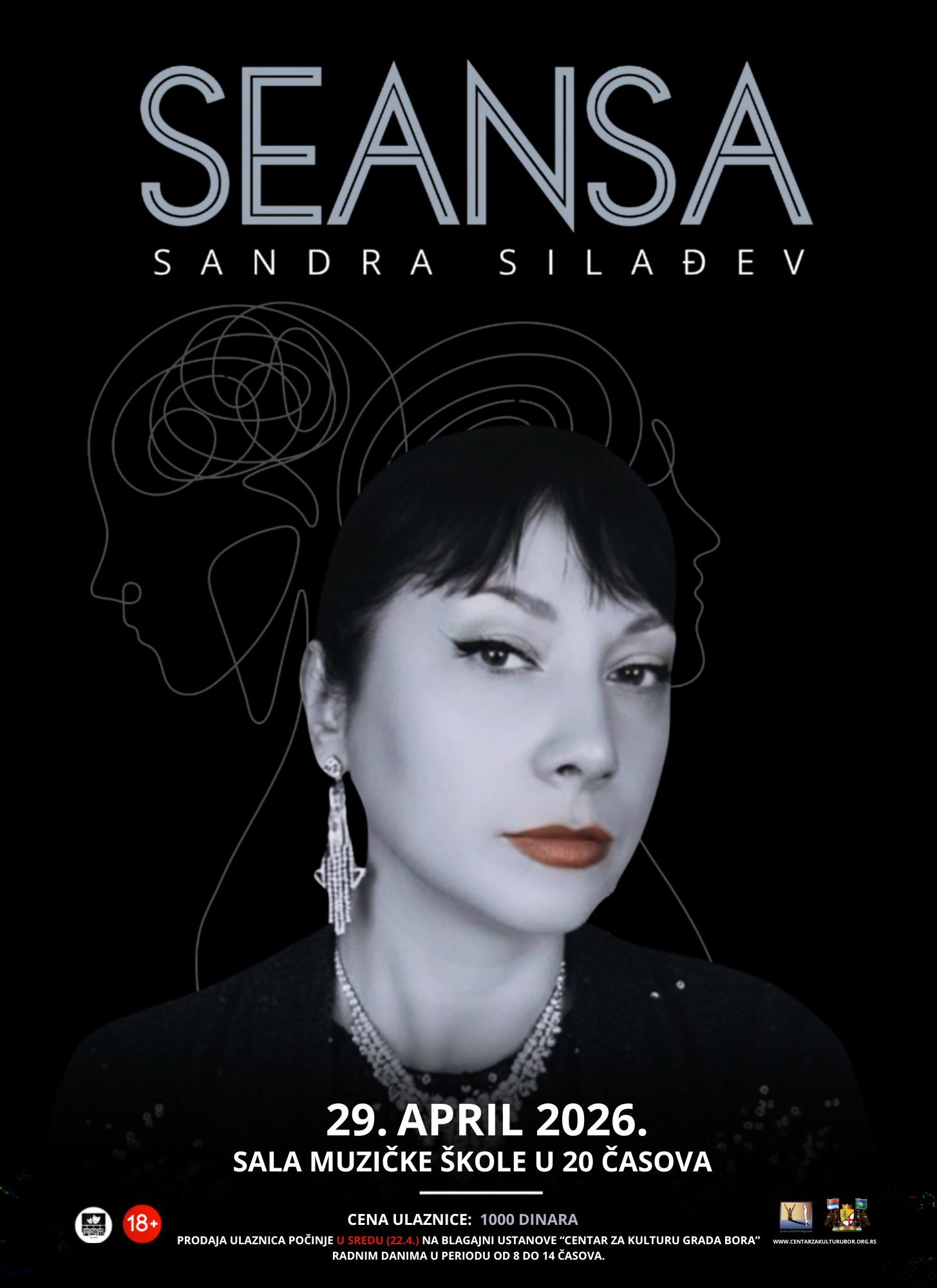 Трећа ауторска монодрама “Сеанса” Сандре Силађев биће одиграна 29. априла у сали Музичке школе са почетком у 20 часова. Цена улазнице је 1000 динара. Продаја улазница почиње у среду, 22. априла, на благајни Установе “Центар за културу града Бора”, радним данима од 8 до 14 часова.